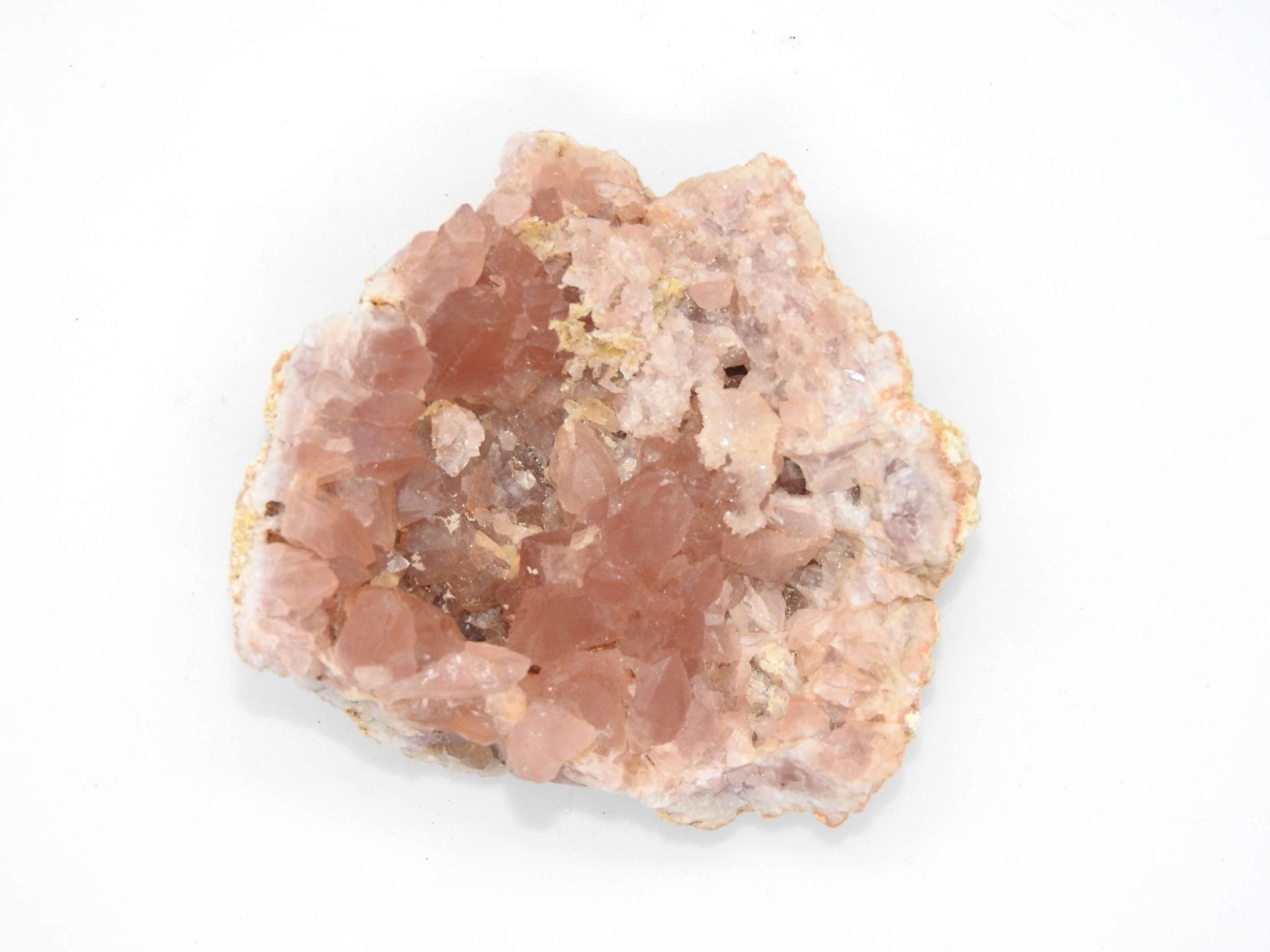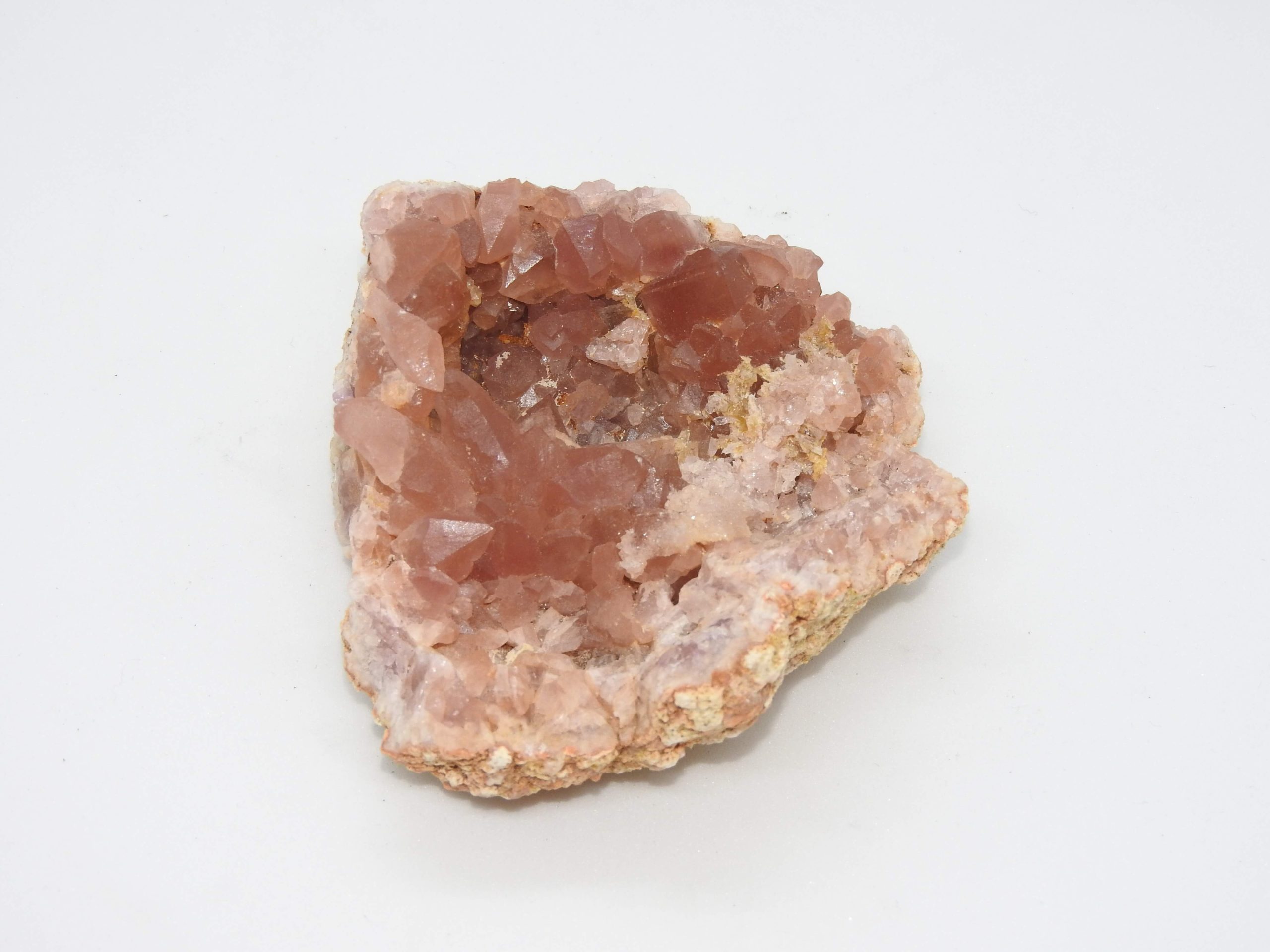 Recristalizada encima cristales de calcita biterminados. 7cm x 7cm de diámetro x 3 cms de profundidad, de color intenso y brillante. Midiendo su cristal más grande 15 mm.