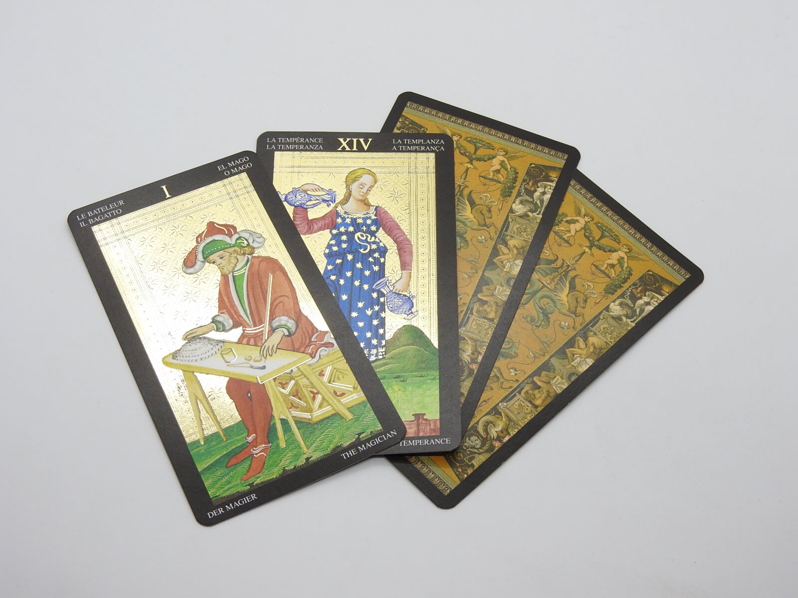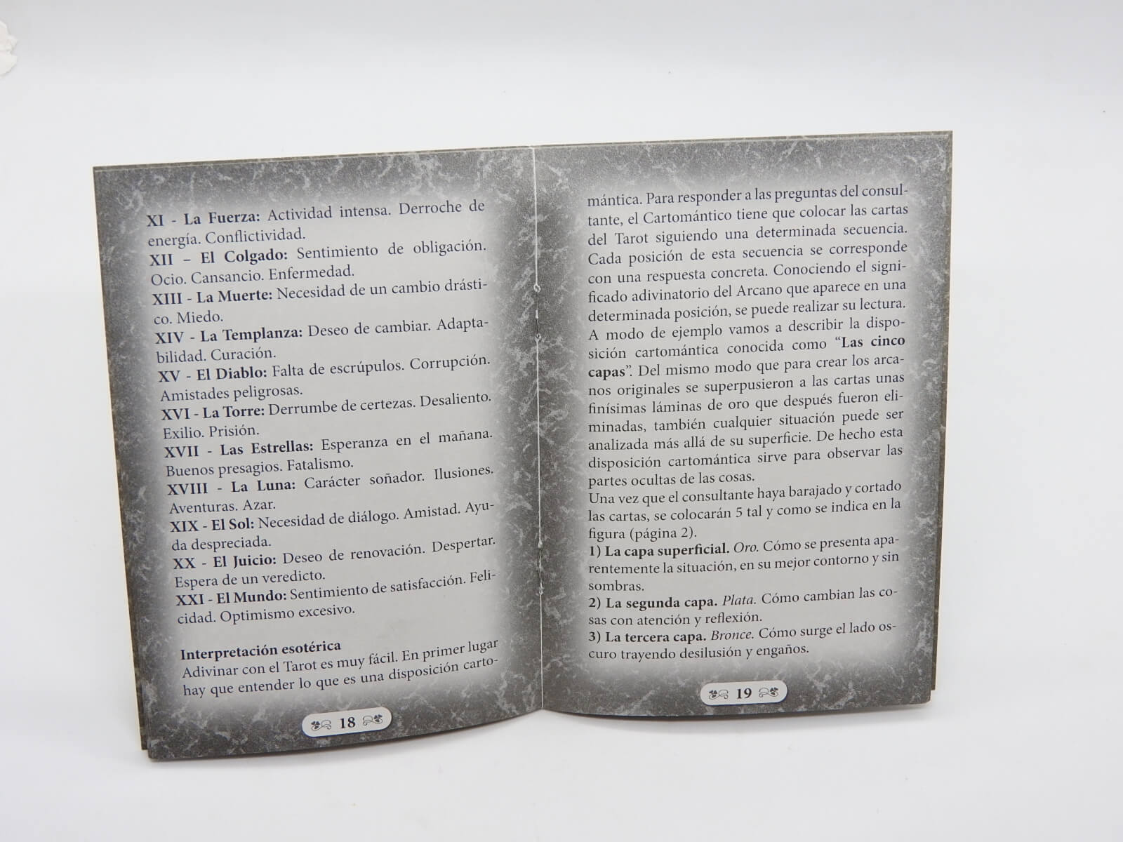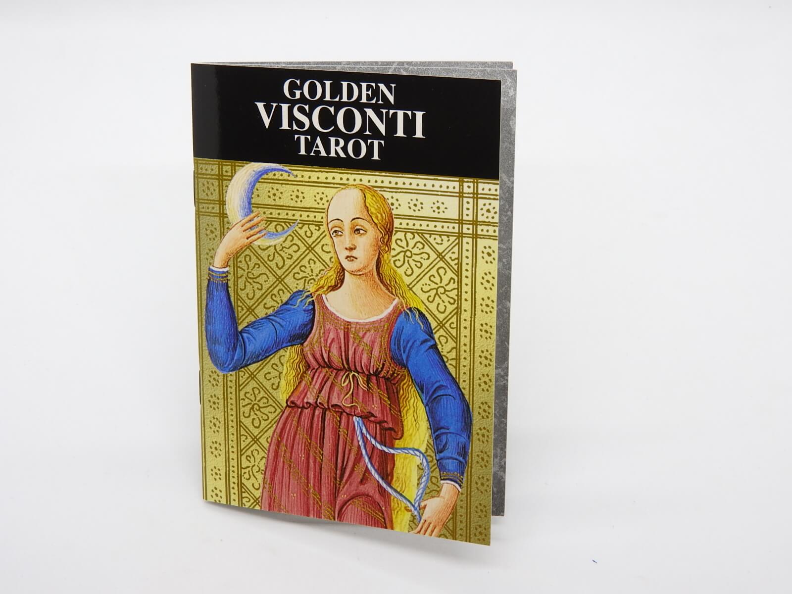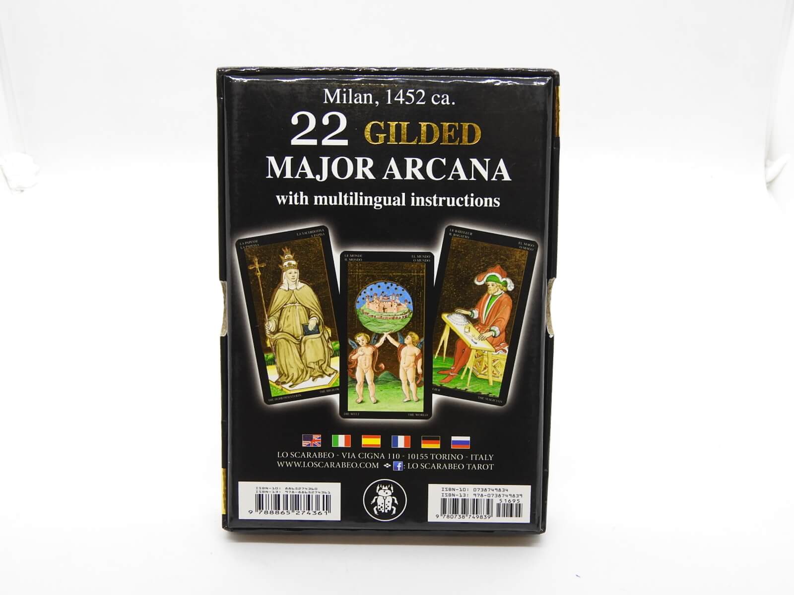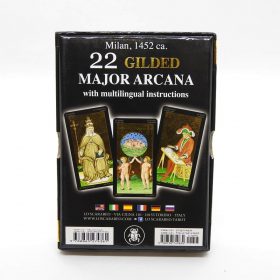 Este mazo es pura magia y misterio, una exhibición absolutamente deslumbrante de lujosa lámina de oro y exquisito arte renacentista. El oro brillante refleja la luz, seduciendo la intuición y deleitando la vista. Este mazo es un tesoro, verdaderamente imprescindible para todos los que tienen interés por el Tarot. Encargada originalmente en 1450 por el duque de Milán y atribuida a Bonifacio Bembo, esta es una reproducción de la baraja de Tarot más antigua que existe.